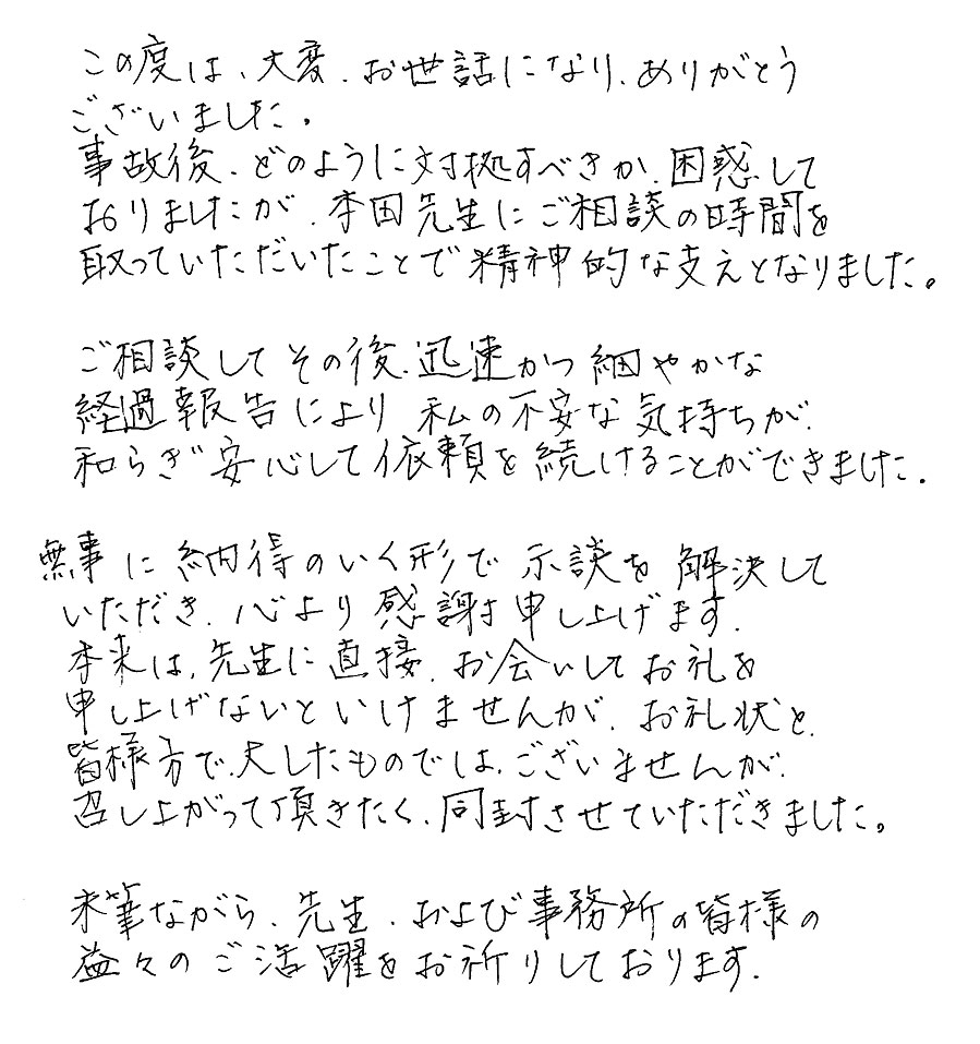 ネットで先生のホームページを拝見し、思い切って相談をさせていただいた結果納得のいく示談ができましたこと、感謝しております。