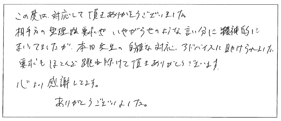 今回、本田先生にお願いした件は、遠方で面倒な事件だったにもかかわらずお引き受け頂き、大変感謝しています。先生には色々とご迷惑をおかけいたしましたが、希望どおりに解決して頂き、とても信頼できる先生にお願いすることができて、心から良かったと思っています。本当にありがとうございました。