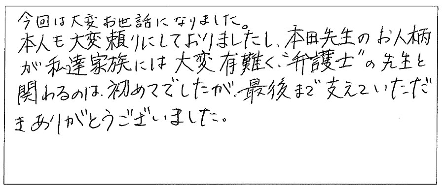 本人も大変頼りにしておりましたし、本田先生のお人柄が私達家族には大変有難く、“弁護士”の先生と関わるのは、初めてでしたが、最後まで支えていただきありがとうございました。